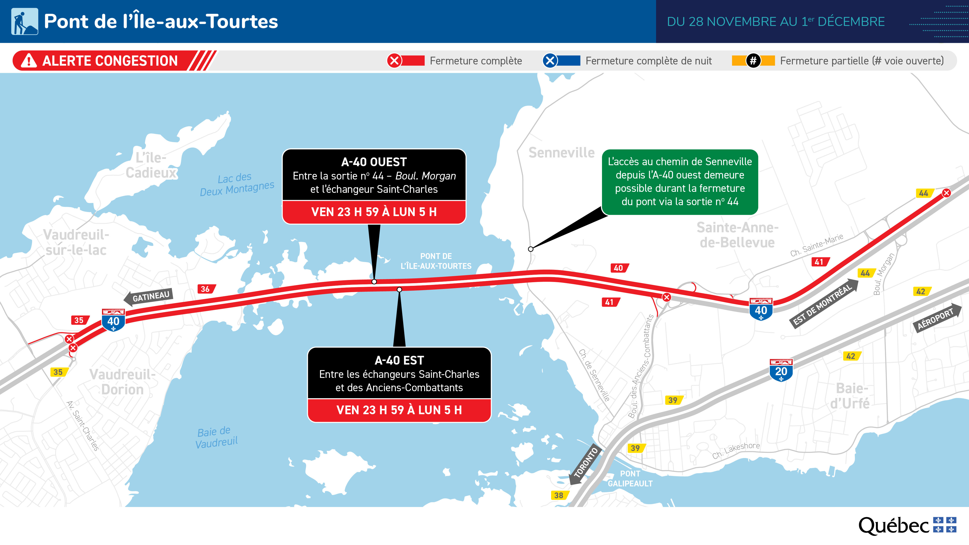 Le ministère des Transports et de la Mobilité durable vous informe que le pont de l’Île-aux-Tourtes, reliant Senneville et Vaudreuil-Dorion dans l’axe de l’autoroute 40 (Félix-Leclerc), sera complètement fermé durant la fin de semaine du 28 novembre. Cette entrave est requise pour mettre en place une nouvelle configuration des voies de l’autoroute 40, à Senneville, qui permettra la poursuite de la reconstruction des dalles.